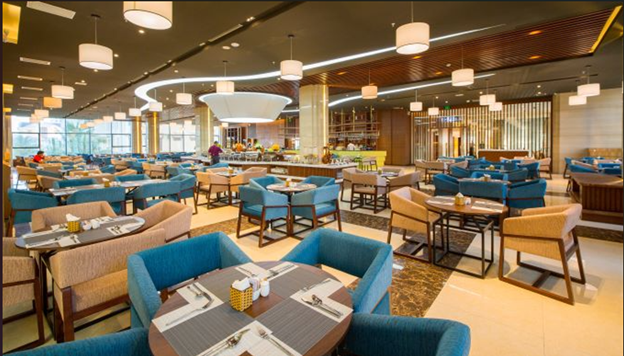 レストランではアジア・ヨーロッパ料理や朝食ビュッフェを提供。バーも充実しています。屋外にはインフィニティプール、スパ、ジム、会議室も完備され、ビジネス利用も快適です。