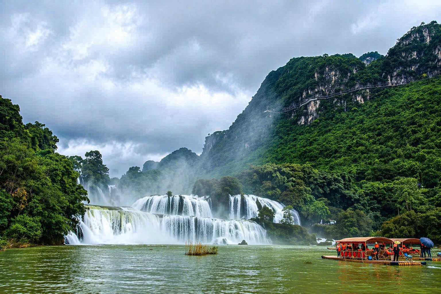 エメラルドグリーンに輝くクアイソン川の水が、幾重にも連なる岩肌を流れ落ちる光景は圧巻で、太陽の光に照らされた水しぶきが虹を描く瞬間は、幻想的な美しさに包まれます。さらに、竹のいかだに乗って滝のすぐ近くまで行ける体験では、轟く水音とひんやりとした霧に包まれながら、自然の迫力を間近に感じることができます。