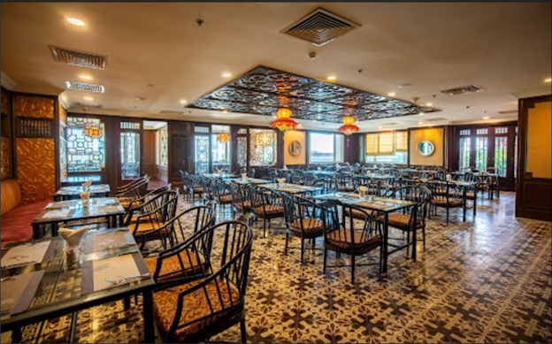 レストランではフエの伝統料理やアジア・ヨーロッパ料理を提供。バーではカクテルや特製ドリンクを楽しめます。