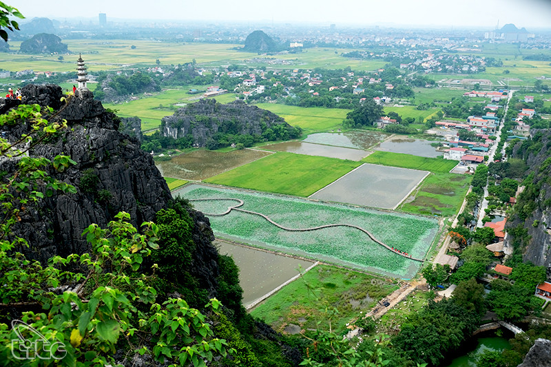 約500段の石段を登ると、眼下にタムコックの奇岩と川の両脇に広がる水田の景色が広がります。