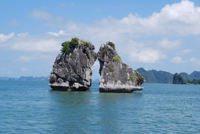 ベトナムの伝説に基づいて名付けられた2つの有名な岩です。伝説によると、かつて住民を驚かしていた海から来た怪物を、一組の夫婦が勇敢に戦い、怪物を追い払ったと言われています。その後、この地で亡くなったとき、彼らの体は2つの大きな岩に変わり、それ以来夫婦岩と呼ばれ、ハロン湾の象徴となったと言われています。また、2羽の鶏が闘っているように見えることから闘鶏岩とも呼ばれています。